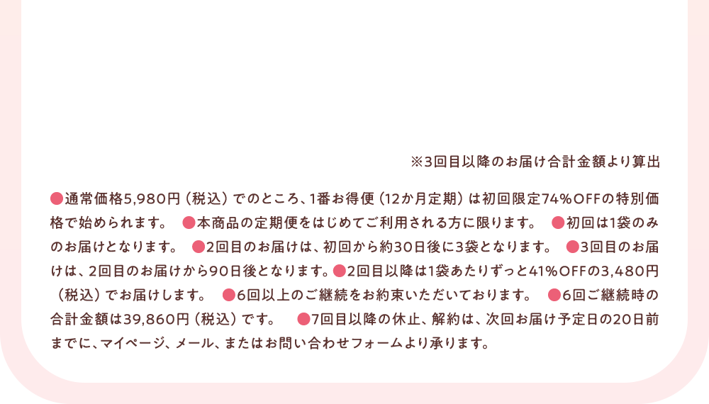 ・クレジットカードでお支払いのお客様(クレジットカード以外の支払方法をご利用の場合は対象外となります) ・公式サイトにて「定期商品」を初めてご注文いただいたお客様※単品購入やリピーターのお客様は対象外となります。